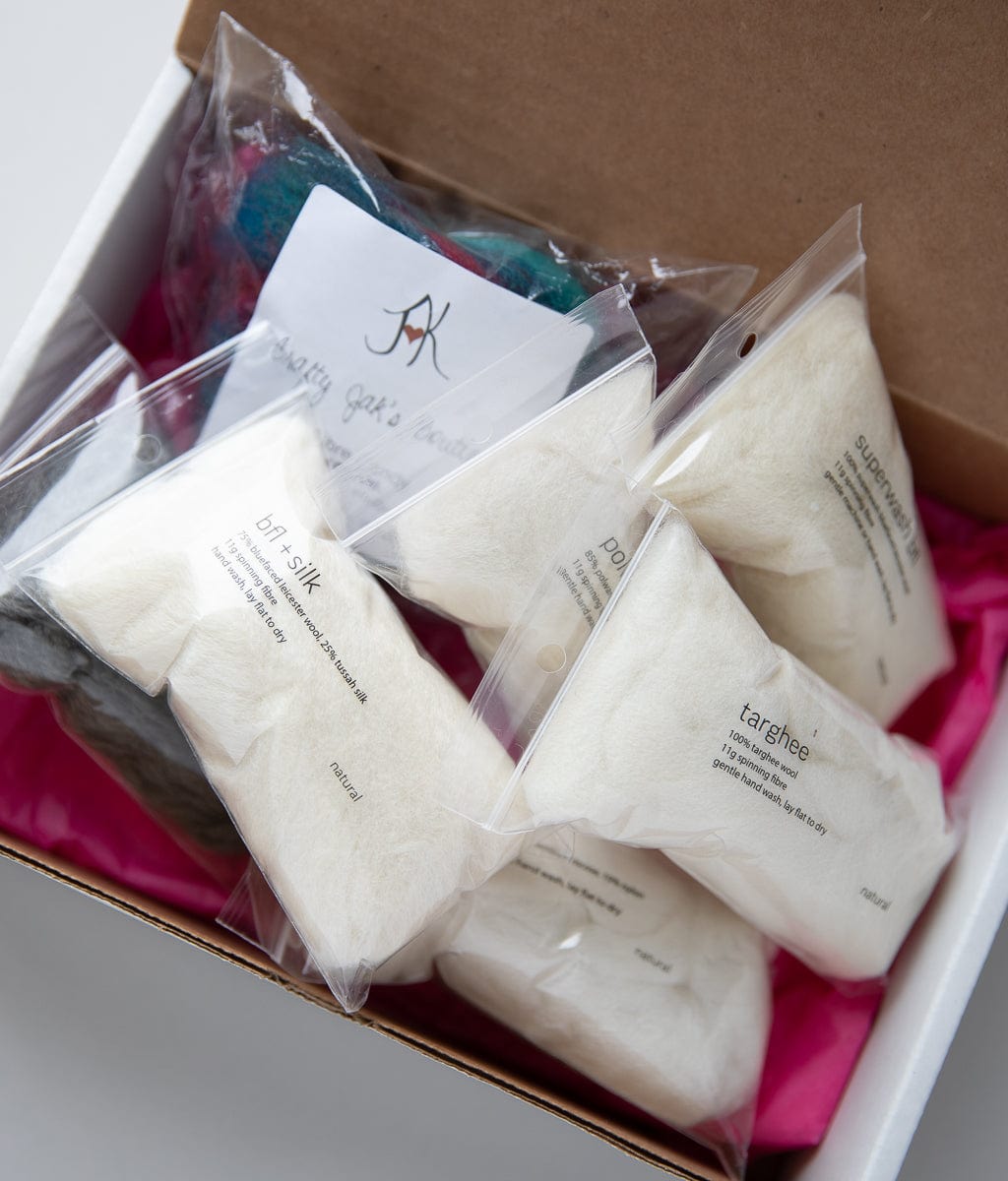A sampling of SweetGeorgia Yarns’ fibre bases and CraftyJak's Boutique’s carded batts.