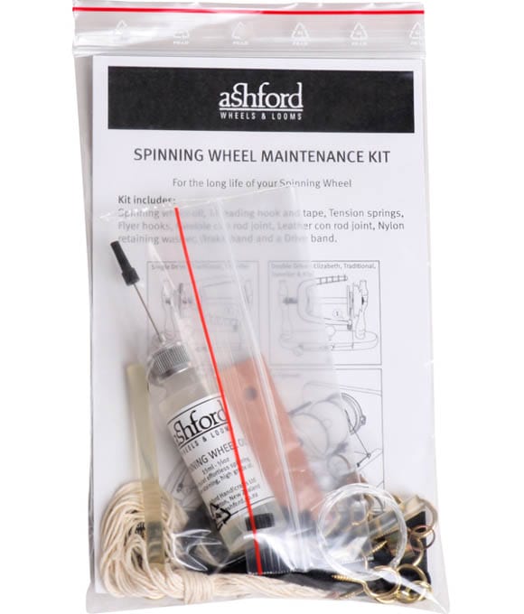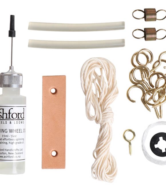 Keep you spinning wheel well maintained and it will last a lifetime! The kit includes 15ml (½ fl ozs) special lubricating oil (non-staining), threading hook, tension spring, flyer hooks, leather conrod connector and clip, brake and drive bands.