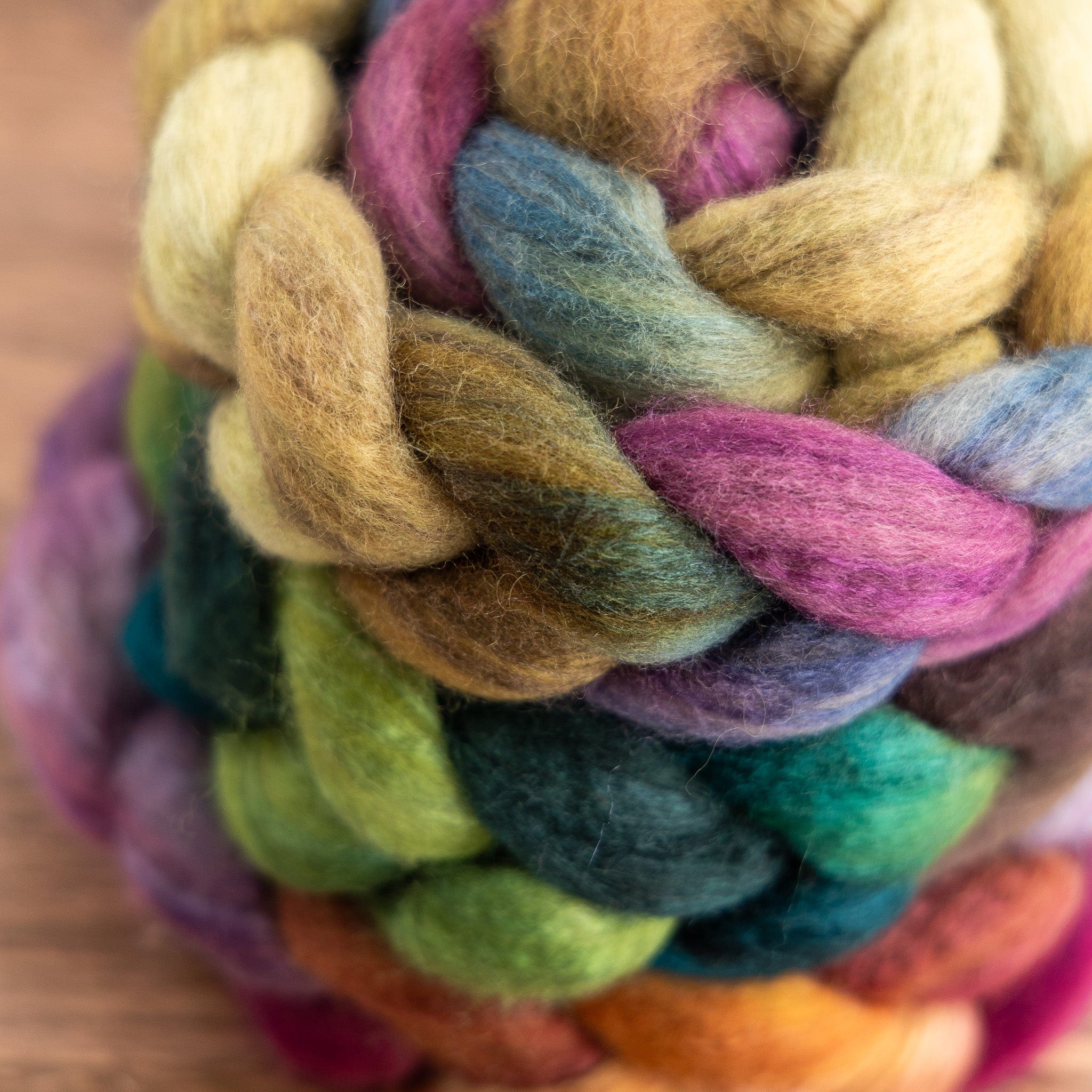 Bluefaced Leicester 75% and Tussah Silk 25% blended together for a very lustrous and luxurious top. Bluefaced Leicester wool (BFL) is one of the softest, glossiest medium-long wools (longer fibre staple length), and naturally more durable, making it a favourite spinning fibre for many. The glittery tussah silk in this blend adds to the softness and shine, making this an indulgence to spin.