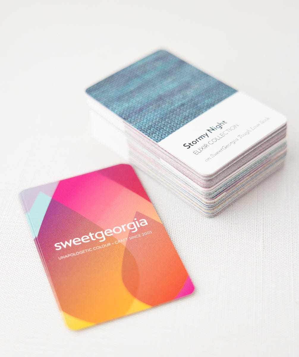 To help you choose colours and see our colourways in-person, we've created Colour Cards for you! Our Colour Cards feature our Tough Love Sock yarn dyed in every one of our colourways.