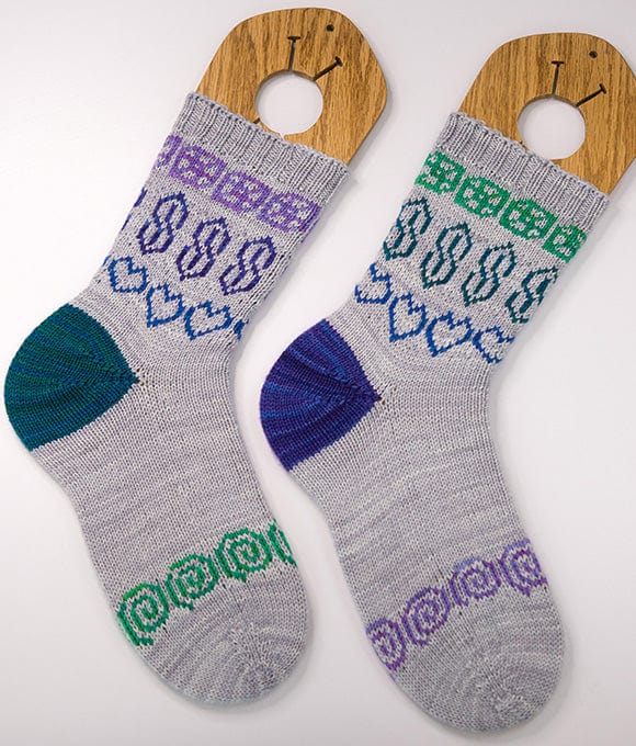 It's nostalgia time! These socks are inspired by the doodles we used to draw in the margins of our middle-school notebooks. Who could forget those fun gel pen colours we weren't allowed to use for our schoolwork? Bright colours, easy construction, and the perfect amount of colourwork, and your heart will be right back in those doodling days.