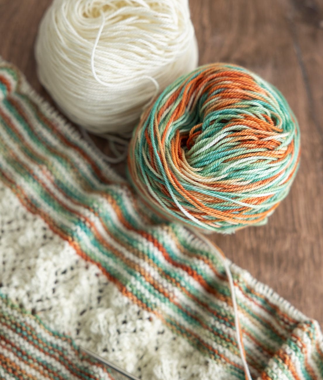 Read more about the story behind this month's colourway at the SweetGeorgia blog. You can also find more information on the Afetos shawl sample shown, designed by Cartucha Knits, at the shawl project post.