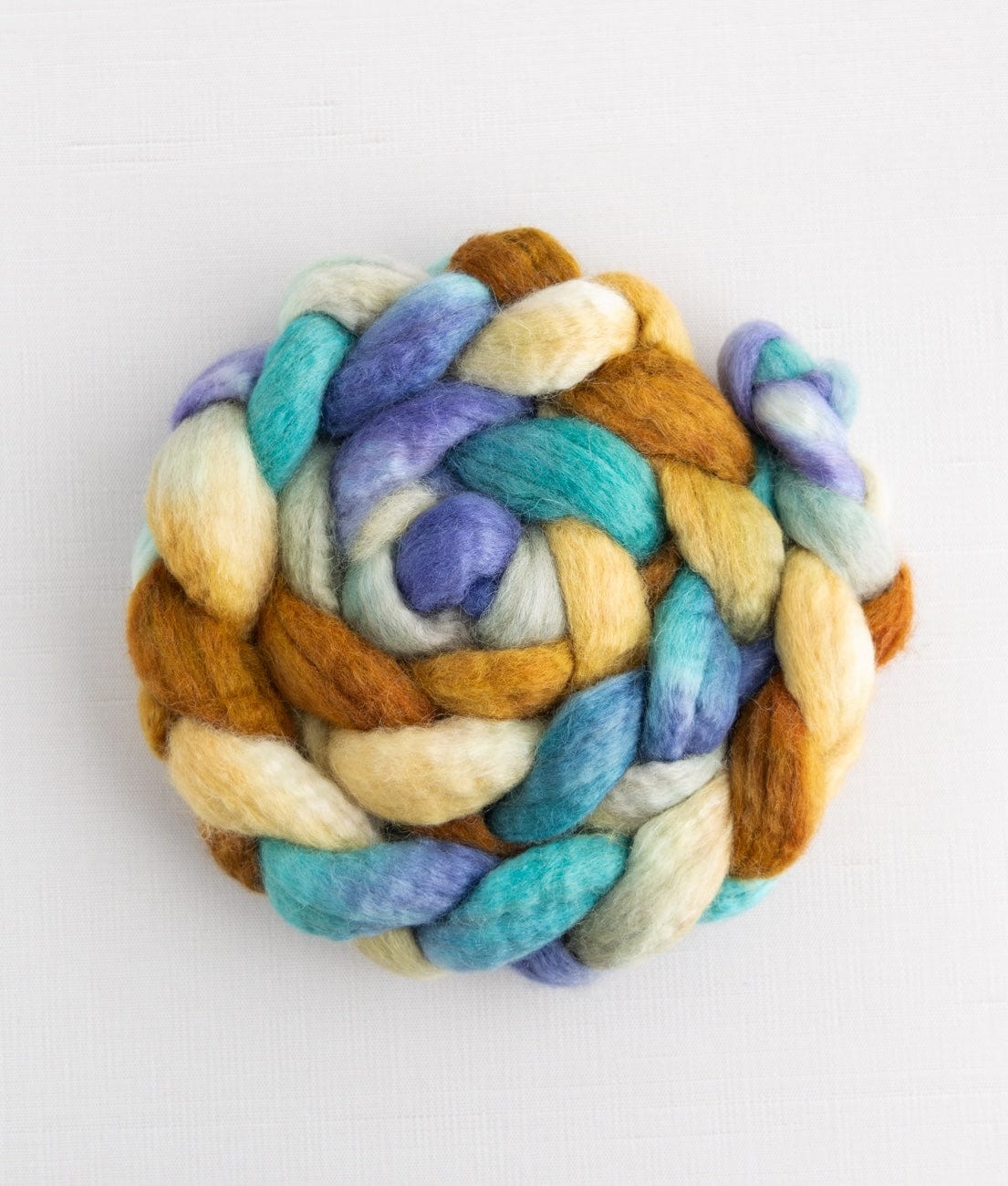 Single braid colourway photos shown are dyed on Polwarth+Silk, except for the following colourways which are dyed on Trifecta Fibre: Beachside Brunch, Salted Caramel, and Stormchaser.